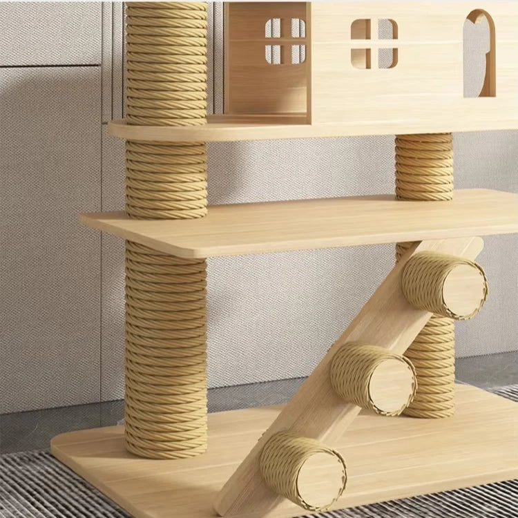 Cet arbre à chat multifonctionnel est conçu pour répondre aux instincts naturels de votre félin : grimper, griffer et se reposer dans un espace sécurisé et stimulant. La structure comprend une base robuste entourée de corde en sisal durable, idéale pour faire les griffes et préserver la santé des pattes tout en protégeant vos meubles. Le transat surélevé offre un perchoir confortable permettant à votre chat d’observer son environnement, tandis que la petite maison fermée constitue une cachette douillette pour dormir ou se retirer au calme. Des éléments additionnels, tels que des jouets suspendus ou des plateformes moelleuses, encouragent le jeu et l’exercice, favorisant l’activité physique et l’enrichissement mental.